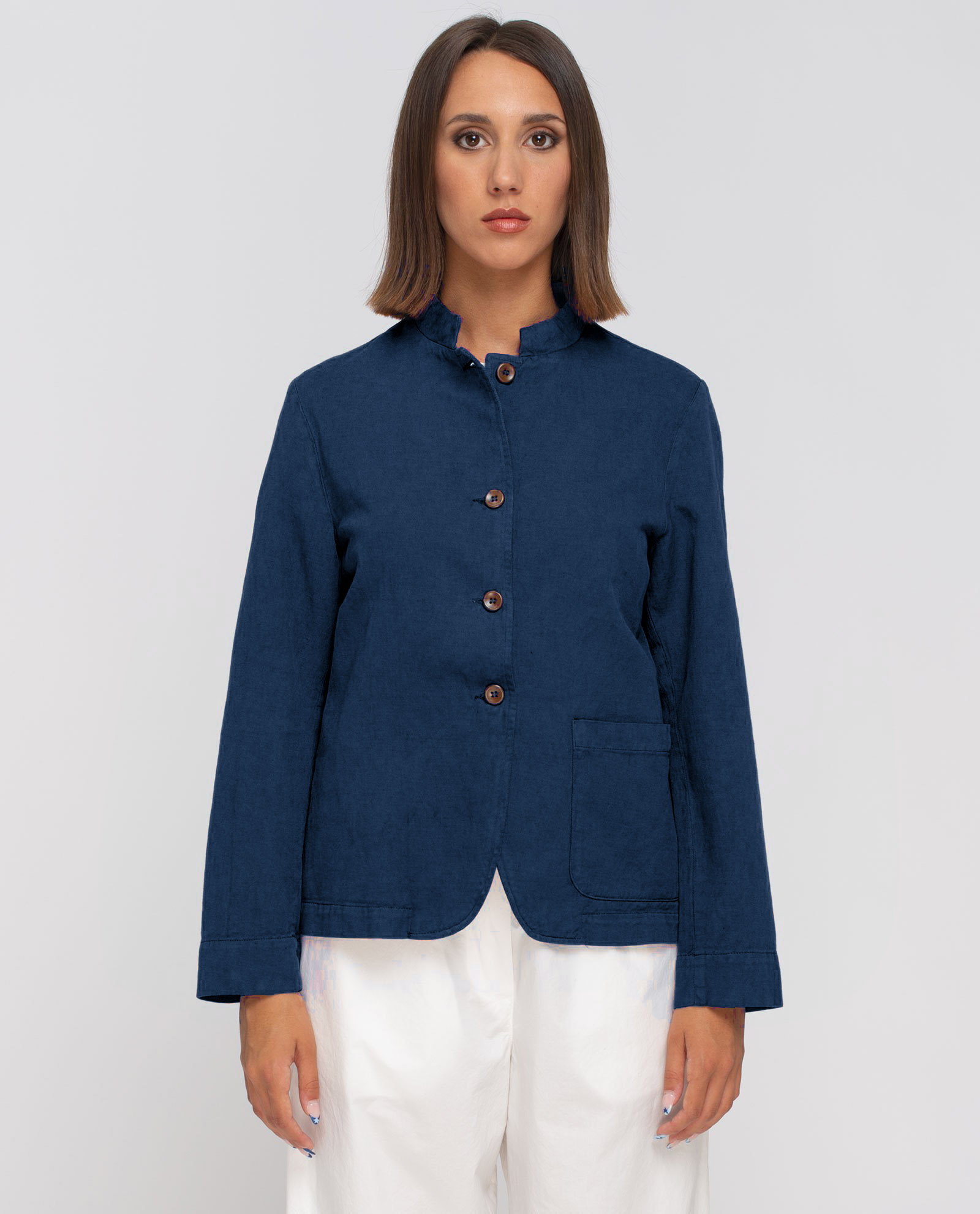 Giacca con collo guru e chiusura frontale con bottoni a vista, caratterizzata da una linea essenziale e femminile. La vestibilità è morbida e leggermente svasata, pensata per seguire le linee del corpo con naturalezza senza costringerle.