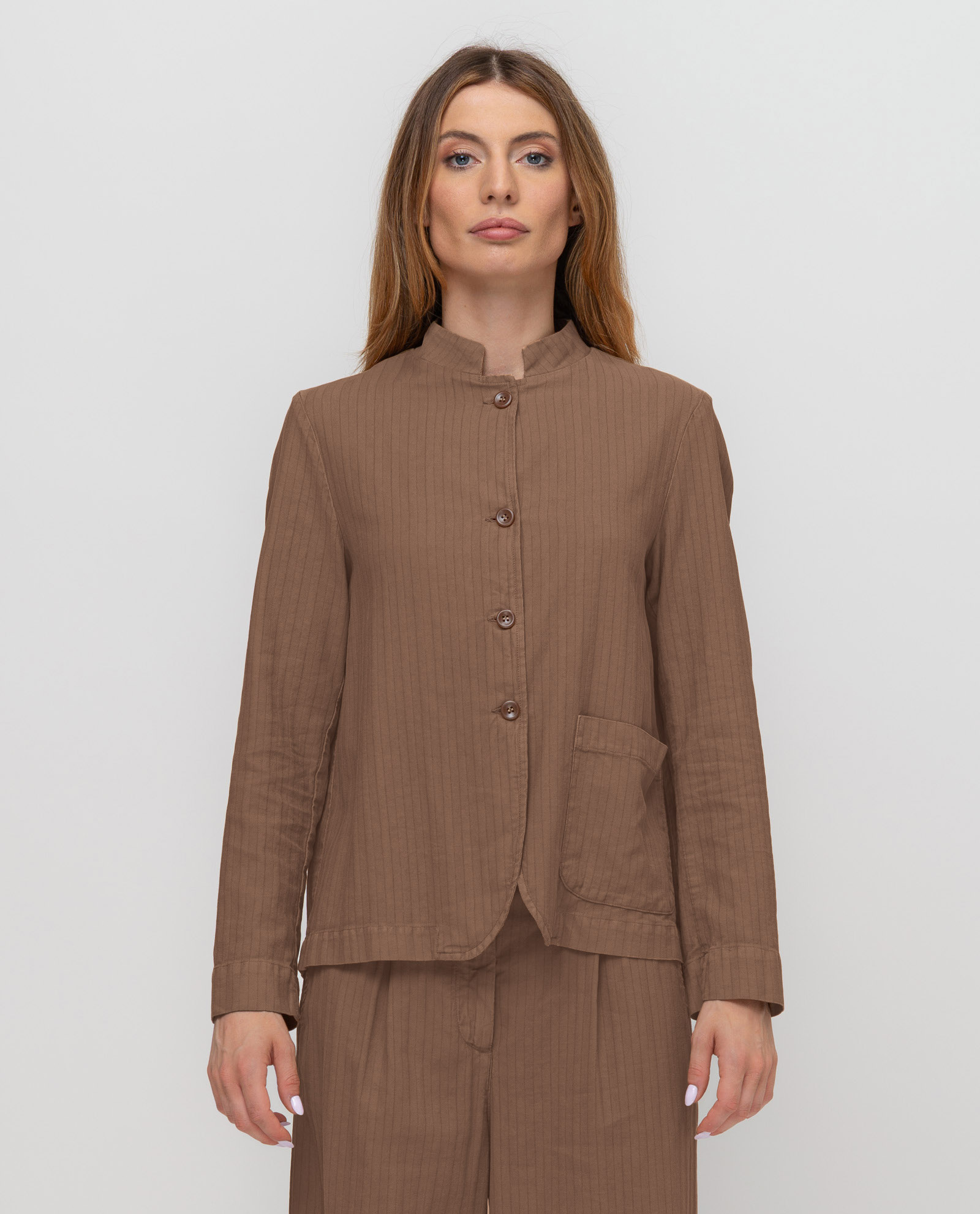 Giacca realizzata in tessuto spinato, una miscela di cotone e lino che unisce struttura e leggerezza. Il modello presenta un collo guru, chiusura frontale con bottoni e una linea leggermente svasata che cade morbida sulle linee del corpo.